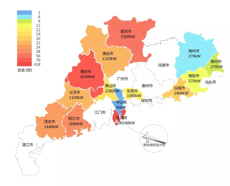 2018年,在港珠澳大桥充电桩项目中,湖南亮风物联网科技有限公司在港珠澳大桥珠海端口岸人工岛搭建的充电管理平台及电能量采集终端,为大桥的绿色运营和电力保障提供技术支持。除此之外,仅广东省内,湖南亮风物联网科技有限公司充电桩涵盖肇庆、珠海等14个城市,具体分布情况如下图所示。